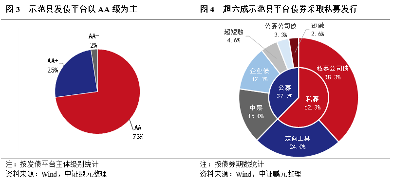 2.超七成示范縣發債平臺主體級別為AA級,超六成示范縣平臺債券采取私募發行