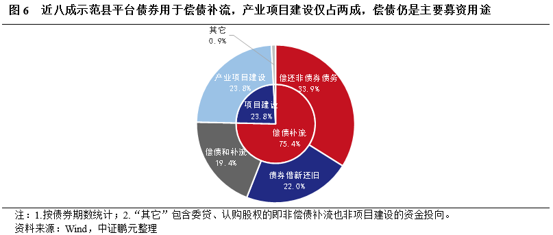 近八成示范縣平臺債券用于償債補流,產業項目建設僅占兩成,償還存量債務仍是主要募資用途。近年來受地方政府債務風險管控影響,導致部分地區或平臺發債融資只能用于償還存量債務,一定程度上限制了新增建設項目用資的債券發行,從而被動提升了示范縣用于償債的債券比例。2020年以來,從明確披露資金用途的345期示范縣平臺債券來看,資金全部用于償債補流的比例高達75.4%,其中明確用于償還到期債券的比例為22.0%。而用于產業項目建設的債券占比僅有23.8%。