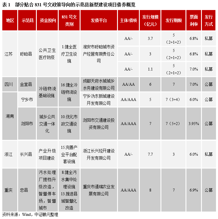 2020年5月發改委《國家發展改革委關于加快開展縣城城鎮化補短板強弱項工作的通知》(發改規劃〔2020〕831號)(以下簡稱“831號文”)將120個縣及縣級市列入縣城新型城鎮化建設示范縣(以下簡稱“示范縣”),隨即同年8月,發改委辦公廳發布《縣城新型城鎮化建設專項企業債券發行指引》(以下簡稱“《指引》”),對符合扶持產業的建設項目予以政策支持。