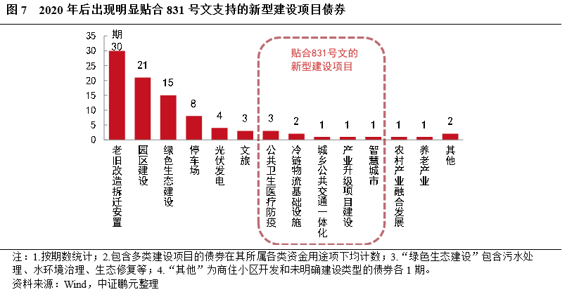 1.2020年以后,出現了資金用途明顯貼合831號文“縣城城鎮化補短板強弱項項目”的新型建設項目債券,此為政策提振示范縣發債的佐證之二