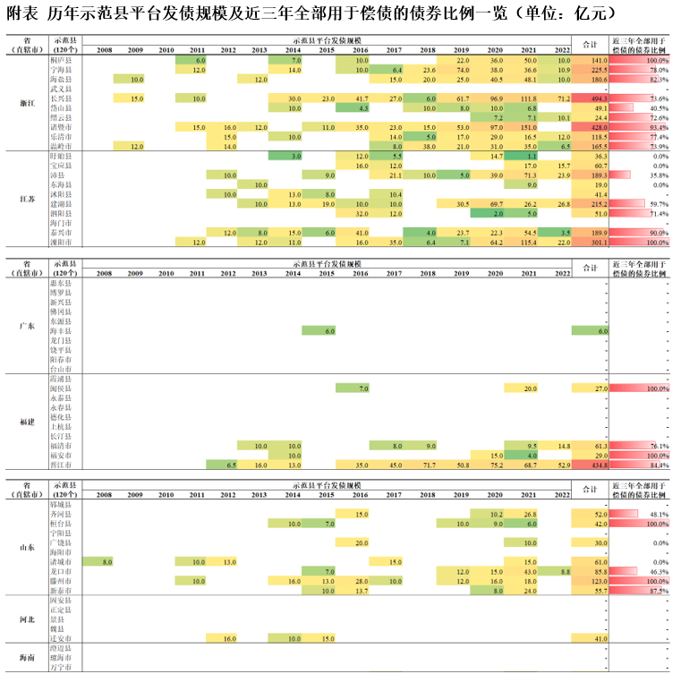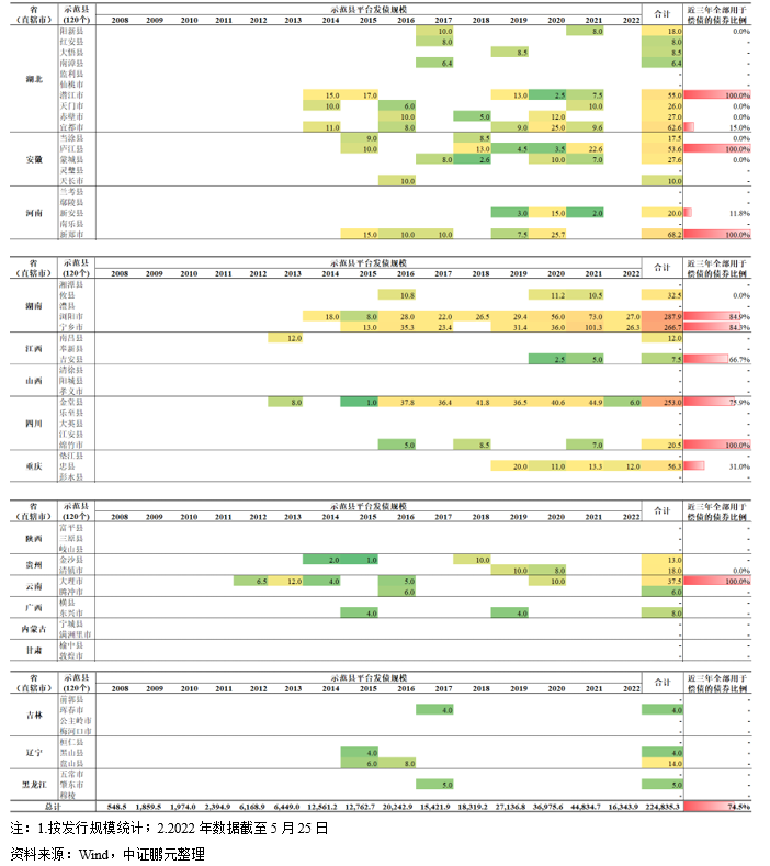 寶應縣、攸縣等11個示范縣近三年平臺債券全部有項目建設用途,推測其地區債務率偏低,可挖掘這11個地區的發債空間。由于自2019年起實施的紅橙黃綠四檔債務率管理制度,債務率偏高的地區發債只能用于借新還舊,不允許新增發債,因而對于近三年仍能新發債券用于項目建設的地區而言,一方面說明其平臺資質相對尚可,另一方面可以合理推測該地區所處縣或上級地級市(注:政策初期是看縣一級的債務率,2021年末起看所處地級市的債務率)的債務率相對偏低,對于一級承攬承做機構來說,或可挖掘這些地區的業務空間。同時,也有11個示范縣近三年的平臺債券全部用于償債,為溧陽市、桐廬縣等地區。