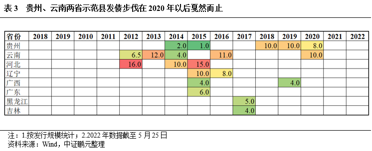 2.貴州、云南兩省,盡管地區經濟亦偏弱,但因前期地方經濟發展戰略吸引到了全國的金融資源,示范縣前期發債步伐明顯快速挺進,但在2020年之后戛然而止,與地區債務率偏高、近兩年風險暴露有關;河北、遼寧、廣西、廣東、黑龍江、吉林六省近三年也未有示范縣平臺發債。