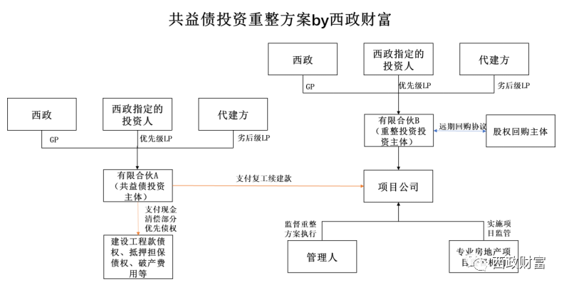 對(duì)于涉及到不良資產(chǎn)的項(xiàng)目,當(dāng)下不少開(kāi)發(fā)商試圖介入其代建的相關(guān)業(yè)務(wù),同時(shí)要求其只負(fù)責(zé)代建,而不愿意出資。對(duì)于此類項(xiàng)目,出于風(fēng)控要求,我們通常會(huì)要求與代建方針對(duì)共益?zhèn)鶛?quán)投資部分與股權(quán)調(diào)整部分分別設(shè)立不同的主體(共益?zhèn)顿Y主體以及重整投資主體)對(duì)項(xiàng)目公司進(jìn)行投資,主要的盤(pán)活資金由共益?zhèn)鶛?quán)投資部分支付,用于收購(gòu)前期的抵押債權(quán)、支付欠付的工程款等;由于項(xiàng)目公司已資不抵債,股權(quán)價(jià)值為0,股權(quán)調(diào)整時(shí)通常由新設(shè)重整投資主體以較低的價(jià)格投入,并100%持股項(xiàng)目公司,并進(jìn)行風(fēng)控措施安排。其中,代建方作為劣后級(jí),出資比例在20%左右。