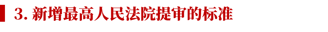 再審審查之后,最高人民法院決定提審的要求更高,需要滿足:(1) 具有普遍法律適用指導意義的;(2) 最高人民法院或者不同高級人民法院之間近三年裁判生效的同類案件存在重大法律適用分歧,截至案件審理時仍未解決的;(3) 最高人民法院認為應當提審的其他情形。