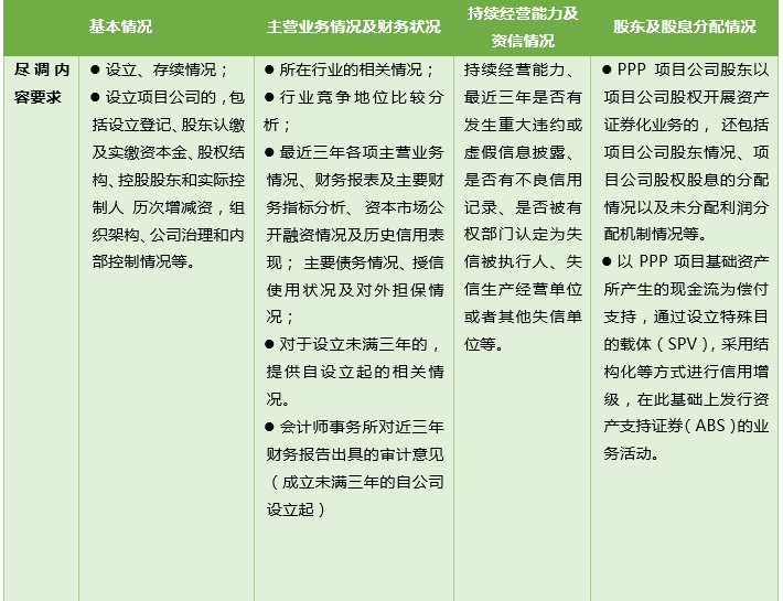 《政府和社會資本合作(PPP) 項(xiàng)目資產(chǎn)證券化業(yè)務(wù)盡職調(diào)查工作細(xì)則》里面詳細(xì)的規(guī)定怎么樣進(jìn)行盡職調(diào)查、盡職調(diào)查的內(nèi)容以及什么樣的結(jié)果滿足要求,內(nèi)容非常詳細(xì)。