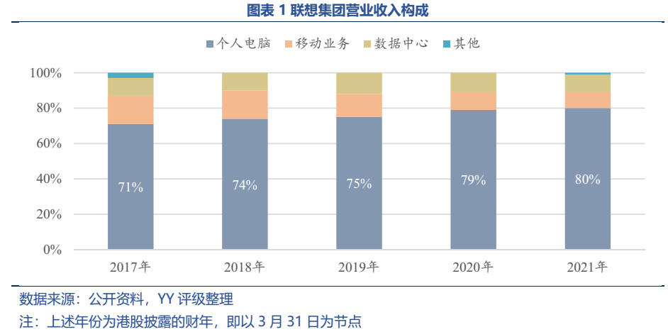 此次申請上市的為港股上市公司聯想集團,而非境內發債主體聯想控股。聯想集團的業務由個人電腦業務、移動業務(主要是智能手機)、數據中心三大板塊構成。其中個人電腦業務仍然是營收的主要來源,營收占比達到70%-80%附近,而科技含量相對較高的數據中心業務僅占比10%左右。