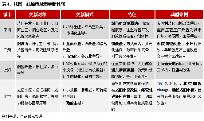 (3)更新方式與對象大同小異。更新方式上無論是留改拆,還是綜合整治與拆除重建,還是全面改造和微改造,無非是改造力度大小,目前還是減少單個的拆除大改造類別,以連片開發,修補、有機更新為主流。更新對象主要是集中在老舊住宅區、廠房、商業、歷史街區和文化歷史建筑,城市風貌和功能方面。