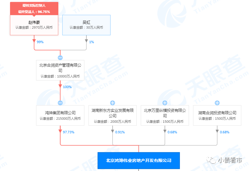從股權(quán)結(jié)構(gòu)上來看,鴻坤地產(chǎn)的控股股東為鴻坤集團,持股比例為97.73%,穿透后實控人為自然人趙偉豪。