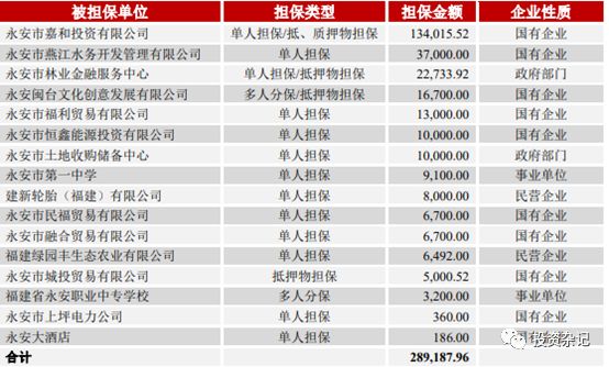 從明細(xì)可以看出,擔(dān)保對象主要是國企、政府部門和事業(yè)單位,其中有兩家民企,不過合計(jì)金額大致是1.45億,相對比較小。最大的兩筆擔(dān)保是對當(dāng)?shù)貒笥腊彩屑魏屯顿Y有限公司(永安市財政局持股100%)和永安市燕江水務(wù)開發(fā)管理有限公司(直接股東是永安市灌區(qū)水利管理站,持股17.5%,永安市自來水公司持股7.5%,中國農(nóng)發(fā)重點(diǎn)建設(shè)基金有限公司,持股75%,農(nóng)發(fā)基金應(yīng)該是明股實(shí)債,該公司實(shí)際控制人應(yīng)該是永安市財政局)的擔(dān)保,金額分別是13.4億和3.7億。這兩個國企沒有發(fā)過債,屬于當(dāng)?shù)卮笃脚_對小平臺的擔(dān)保。