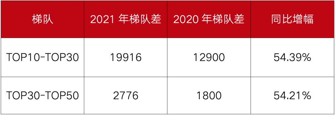 表:2021-2020年各梯隊(duì)企業(yè)在管門(mén)檻值梯隊(duì)差對(duì)比(萬(wàn)平方米)
