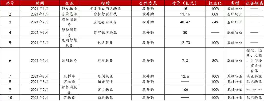 年內(nèi),碧桂園服務(wù)、萬(wàn)物云、世茂服務(wù)、金科服務(wù)等多家企業(yè)不斷出手優(yōu)質(zhì)標(biāo)的,高交易額、高頻次;并刷新業(yè)內(nèi)最貴收購(gòu)單價(jià)記錄(碧桂園服務(wù)更是斥資百億收購(gòu)富力物業(yè));亦出現(xiàn)“小吃大”的經(jīng)典案例,合景悠活拿出1/3募資額收購(gòu)斥資13.6億收購(gòu)雪松智聯(lián)。