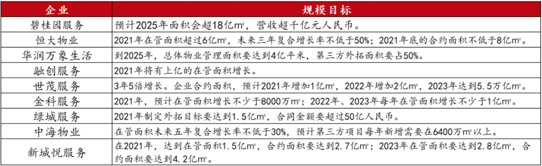 頭部企業(yè)更是定下高達(dá)數(shù)億的增長(zhǎng)目標(biāo),恒大物業(yè)2021年在管面積將破6億㎡,合約面積不低于8億㎡;綠城服務(wù)合約面積將新增1.5億㎡,碧桂園服務(wù)則表示2025年規(guī)模超18億㎡,營(yíng)收要超過(guò)千億元。世茂服務(wù)亦提出3年5倍計(jì)劃,2021年增加合約面積1億㎡,預(yù)計(jì)2023年合約面積達(dá)5.5億㎡。