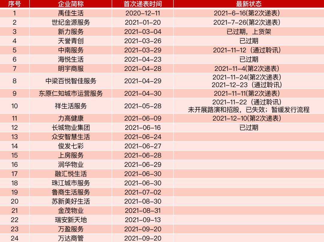 在市場(chǎng)的冰凍期,監(jiān)管層考慮、投資人離場(chǎng)心態(tài)、母公司急需資金紓困以及企業(yè)自身意愿的多重因素影響下,2021年下半年待上市物企被擺上貨架出售、推遲上市或者已經(jīng)通過(guò)聆訊也暫停上市。