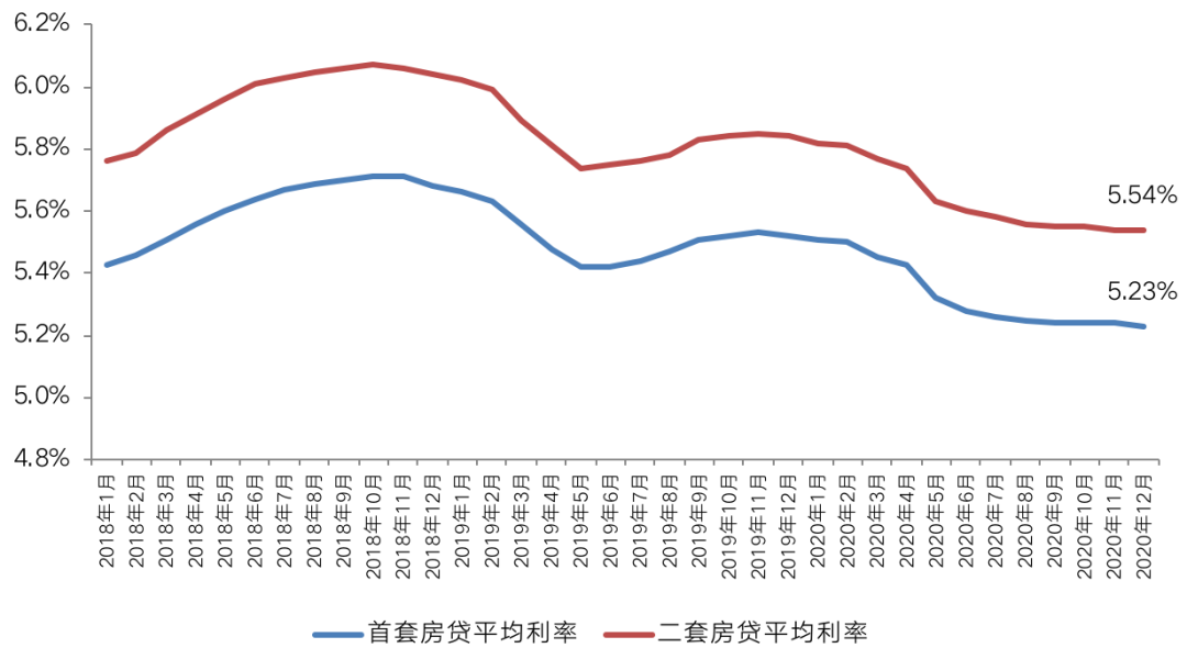 具體來看,上半年房地產(chǎn)信貸政策中性偏積極,央行三度降準(zhǔn)釋放長期資金約1.75萬億元,并兩度下調(diào)LPR利率中樞,5年期以上LPR累計降幅達(dá)15個基點。受惠于信貸資金整體合理充裕,疊加LPR利率兩度下調(diào),房貸利率趨勢性下滑。融360數(shù)據(jù)顯示,截至2020年12月,全國首套房貸平均利率5.23%,較2019年12月減少29個基點;二套房貸平均利率5.54%,較2019年12月減少30個基點。