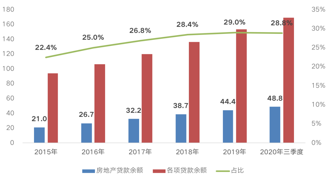 截至2020年三季度,全國房地產(chǎn)貸款余額高達(dá)48.8萬億元,較2015年凈增長132%,占各項貸款余額的比重多達(dá)28.8%,較2015年提升6.4個百分點。說明在實體經(jīng)濟投資回報率低、風(fēng)險高企的大環(huán)境下,房地產(chǎn)行業(yè)“吸金”效應(yīng)依舊不減。
