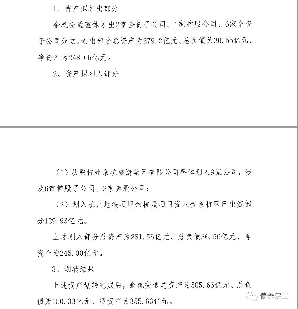 根據余杭交通的公告信息,劃出資產部分的總規模為279.20億元,劃入資產的總規模為281.56億元。