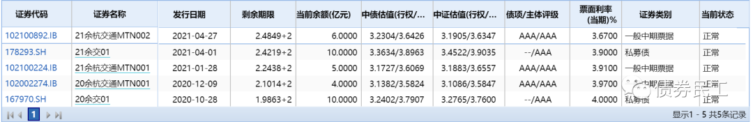 余杭交通的存續債券金額為35億元,存續債券5只,存續債券產品包括中期票據和私募債,未發行過企業債券。