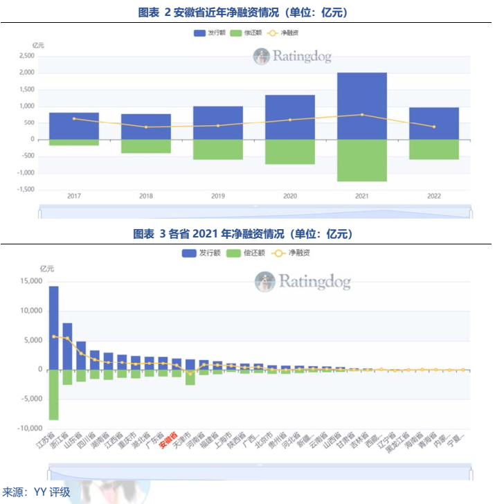 同樣沒有存在感的還有安徽的債務規模。21年存續有息債務總量17,142.29億元與凈融資規模760.43億元,債務壓力與經濟實力相匹配。除18年天長城投擔保違約外,近年也未發生有顯著影響的負面事件,區域內折價成交極少,整體風險可控。對于債市沒有存在感或許是件好事。