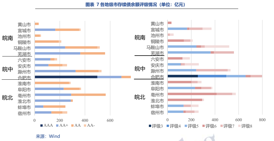 除合肥外,省內其他地市平臺較為平庸,地級市主平臺以AA和AA+為主,整體沒有特別網紅的區域,蚌埠近年產業發展面臨困境需關注風險。