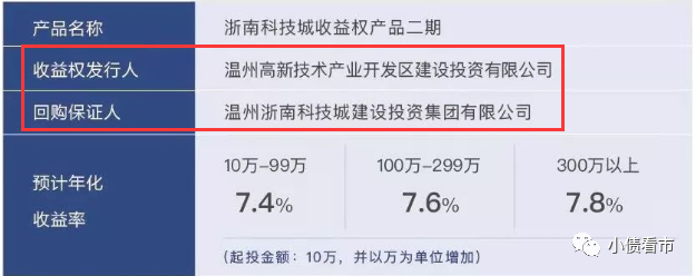 據(jù)悉,該收益權(quán)產(chǎn)品回購保證人為溫州浙南科技城建設(shè)投資集團(tuán)有限公司(以下簡稱“浙南科技城建投集團(tuán)”),產(chǎn)品期限為兩年,資金用途為浙南科技城八大重點(diǎn)項(xiàng)目建設(shè),認(rèn)購起點(diǎn)金額為10萬元。