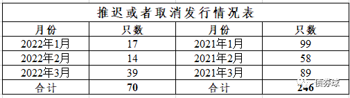 一般來(lái)說(shuō),每年1月份或者2月份大概率會(huì)碰到春節(jié),發(fā)行活動(dòng)一般不是很多,進(jìn)而取消發(fā)行的數(shù)量也相對(duì)較低。2022年的數(shù)據(jù)的確比較符合這一邏輯,但是對(duì)比一下2021年同期的數(shù)據(jù),似乎又難以說(shuō)得通。2021年1季度, 1月份取消發(fā)行最多。