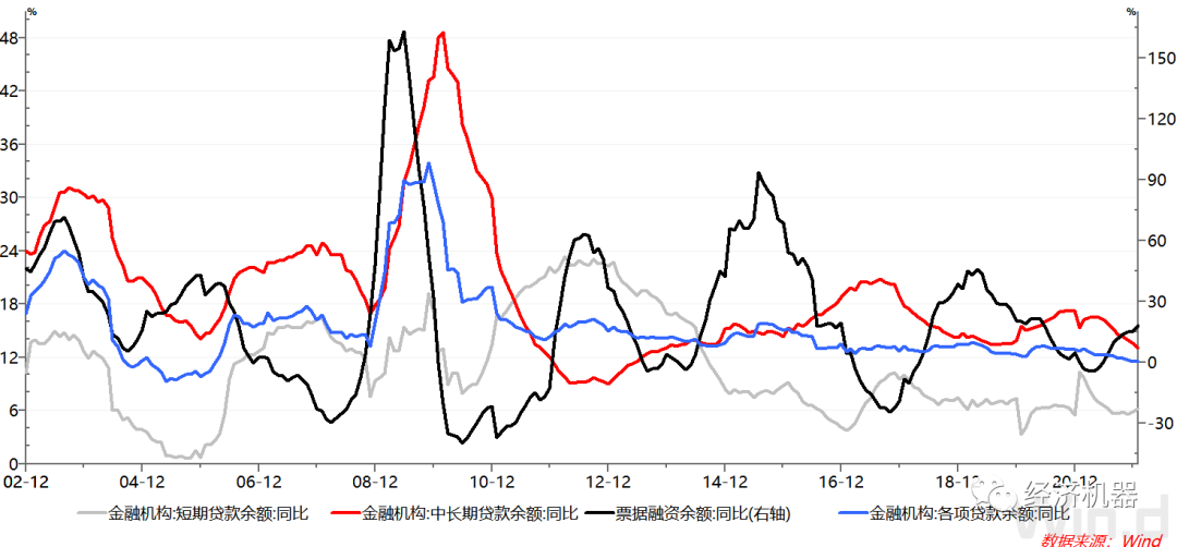 居民戶中長期貸款則新增7424億元,同比少增2024億元,與2020年同期基本持平(圖2)。以按揭貸款為主的居民戶中長期貸款同比繼續大幅少增,反映了當前居民購房意愿不足,需求乏力。但新房銷售的下滑幅度相比,居民中長期貸款降幅并不明顯。據克而瑞數據顯示,1月TOP100房企單月銷售金額同比降低約40%,顯示銀行很可能為了1月份“沖量”,“透支”了部分信貸需求。因此,房地產市場下滑態勢如果不及時扭轉,仍有可能導致信貸出現一定“塌方”風險。