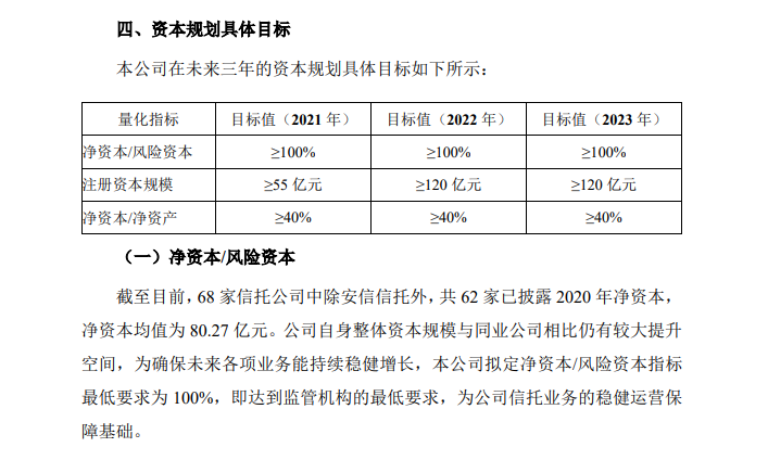 回看7.24日的公告,在《未來三年資本管理及使用規劃》中,找到了答案。在這份公告和另一份《未來三年股東回報規劃》中,安信信托已經謀劃了未來三年發展的計劃。