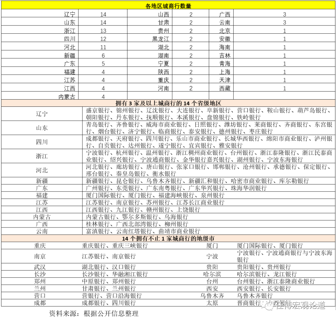 1、14個省級地區分別至少擁有3家城商行,集中于遼魯川浙冀等地
