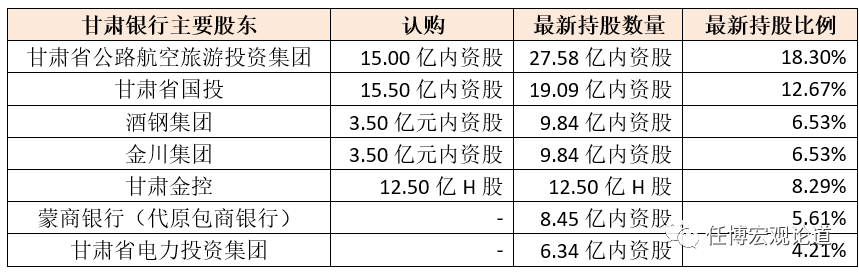 經過此次改革重組后,甘肅省公路航空旅游投資集團、甘肅省國投、酒鋼集團、金川集團、甘肅金控以及甘肅省電力投資集團合計持有甘肅銀行的股權比例達到56.53%,蒙商銀行的持股比例則由之前的8.39%降至目前的5.61%、由第二大股東降至第六大股東。