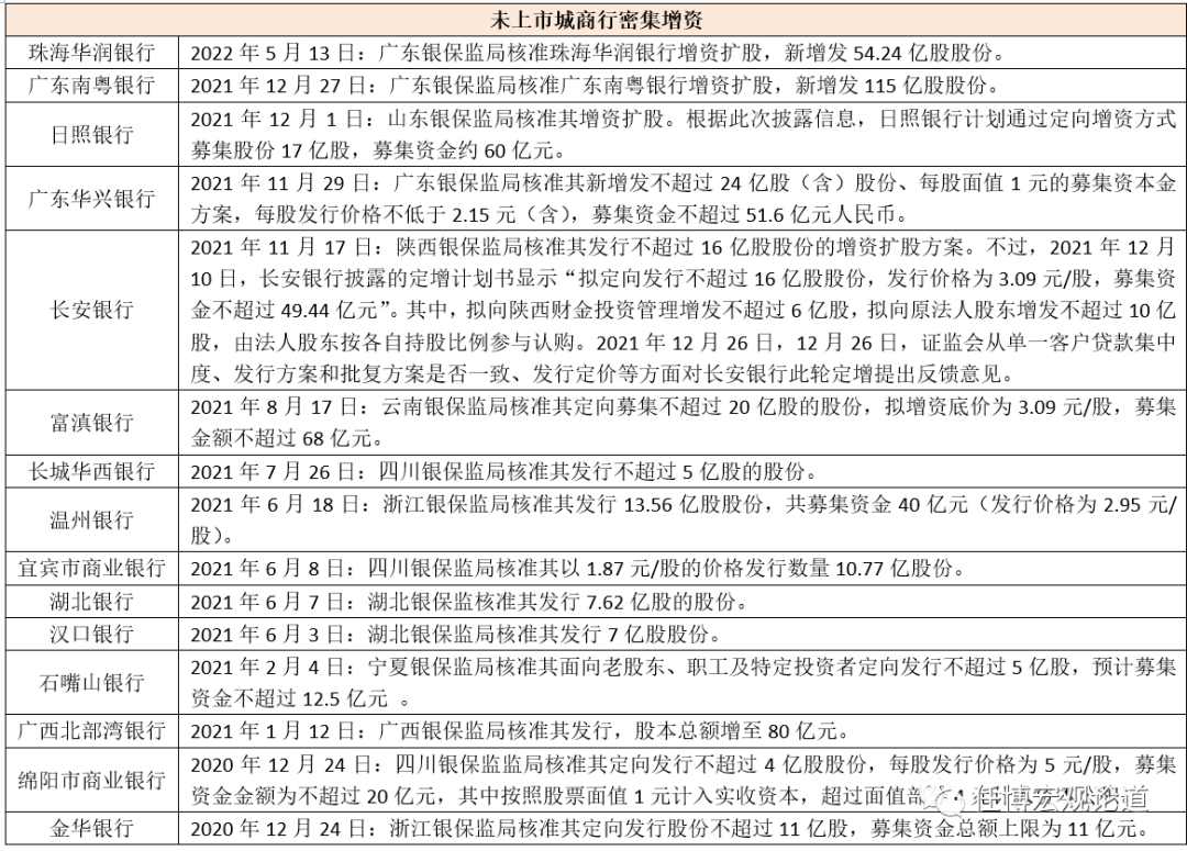 未上市銀行增資主要有三個目的,一是為了提升信貸投放能力,二是為上市做準備、打好基礎,三是增資過程中還可以兜售掉一部分不良資產。根據公開信息來看,僅2021年以來,便有珠海華潤銀行、廣東南粵銀行、日照銀行、廣東華興銀行、長安銀行、富滇銀行、長城華西銀行、溫州銀行、宜賓市商業銀行、湖北銀行、漢口銀行、石嘴山銀行以及廣西北部灣銀行等11家城商行的增資擴股方案獲批。預計,在上市、化險等動力下,未上市城商行的增資潮仍將持續。