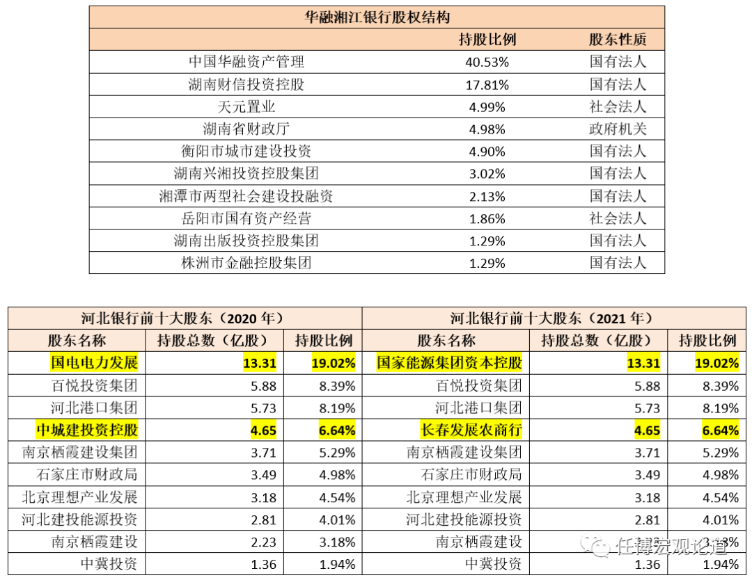 (1)2021年8月6日,原河北銀行第一大股東國電電力發展發布《關于公司與國家能源集團進行資產置換暨關聯交易的公告》稱擬將其持有的河北銀行全部股權及另一家子公司股權,與其控股股東國家能源投資集團旗下11家子公司進行置換。置換完成后,國家能源投資集團躋身河北銀行第一大股東,國家能源投資集團持有國電電力發展的股權比例為46%。