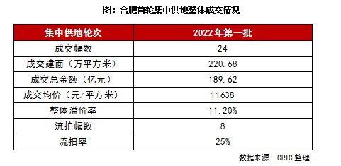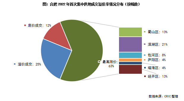 在土拍門檻降低、土地成本控制得當,以及部分政策利好消息的雙重影響下,合肥本次土拍平均溢價率達到11.2%,是2022年目前已經進行集中供地的城市中平均溢價率最高的一個,15宗地塊觸及最高溢價率,占總成交地塊比例的63%。