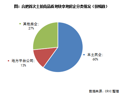 從拿地結果來看,合肥本土房企表現強勢:在15宗競品質地塊中,本土民企拿下9宗,安徽邦泰、安徽天阜、安徽置地、偉星、尚澤等均有所斬獲,此外安徽高速也競得2宗濱湖科學城地塊,本土企業投資積極性復蘇,且整體表現非常強勢,拿下六成競品質地塊。