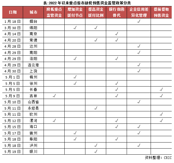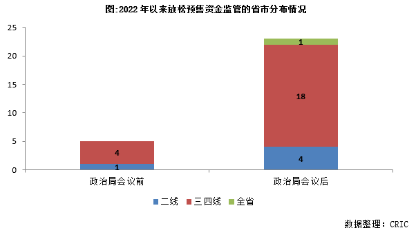 以政治局會(huì)議為分界線,預(yù)售資金監(jiān)管政策解綁頻率明顯加快。4月29日,政治局會(huì)議強(qiáng)調(diào),支持各地從當(dāng)?shù)貙?shí)際出發(fā)完善房地產(chǎn)政策,支持剛性和改善性住房需求,優(yōu)化商品房預(yù)售資金監(jiān)管,促進(jìn)房地產(chǎn)市場(chǎng)平穩(wěn)健康發(fā)展。在此之前,僅南京、煙臺(tái)、綿陽(yáng)等5城放松預(yù)售資金監(jiān)管;而在此之后,已有成都、海口、長(zhǎng)春等21省市放松預(yù)售資金監(jiān)管。尤其是三四線城市,政策解綁城市數(shù)量由4城大幅擴(kuò)容至18城,其中不乏徐州、中山、洛陽(yáng)等強(qiáng)三線城市。
