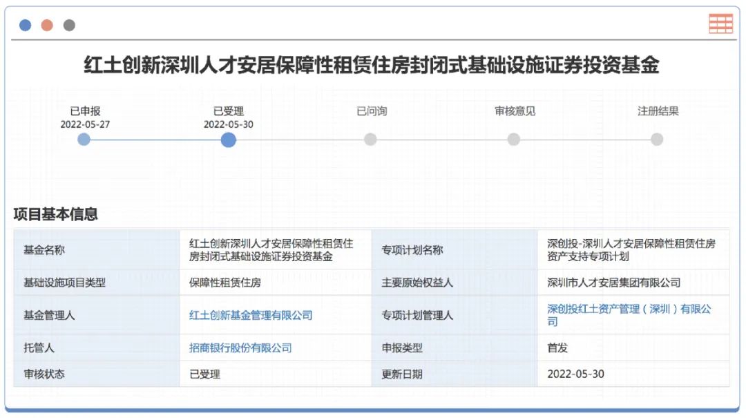 2022年5月27日,中金廈門安居保障性租賃住房、紅土創新深圳人才安居保障性租賃住房兩只REITs分別于上交所、深交所和證監會報送申請材料,成為首批上報的兩單保障性租賃住房REITs。這是保租房自去年6月納入基礎設施REITs發行范圍以來,取得的突破性進展。