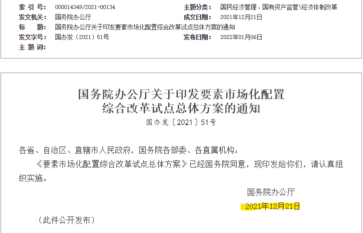 2022年1月6日,國辦對外發布了《要素市場化配置綜合改革試點總體方案》(下文簡稱“方案”)。方案是2021年12月21日印發的。