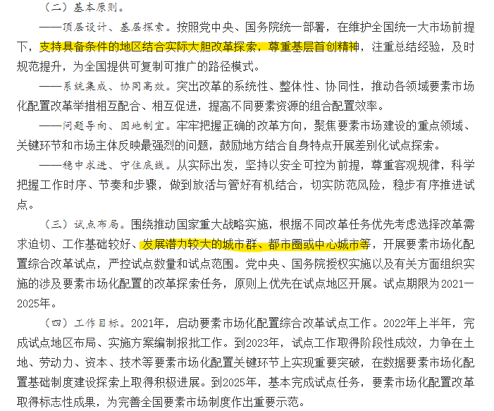 因為方案是2021年末印發的,所以方案的工作目標說2021年,啟動要素市場化配置綜合改革試點工作。2022年上半年,完成試點地區布局、實施方案編制報批工作。