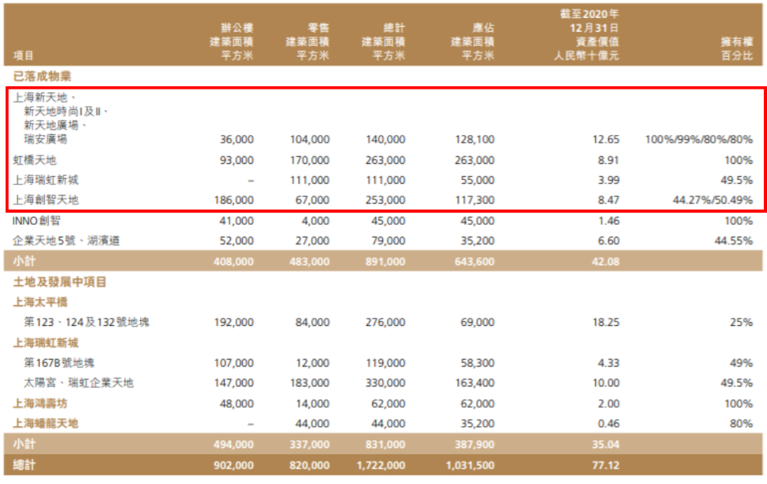 另據2020年瑞安房地產年報顯示:“本集團目前於上海持有及管理作零售及辦公樓用途的總建築面積達172萬平方米(「上海物業組合」)。截至2020年12月31日,上海商業物業組合的資產價值總額約為人民幣770億元?!?/p>