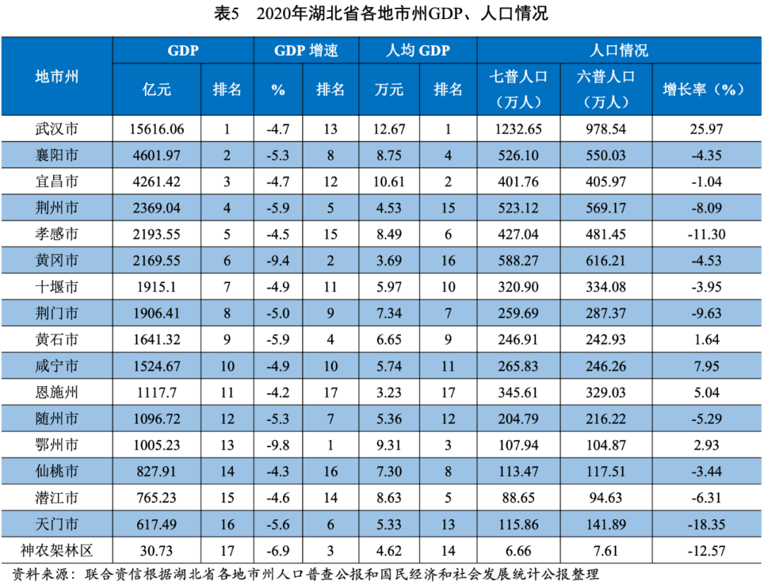 從地市州層面看,湖北省各地市州經濟發展和財政實力分化程度較明顯,武漢市經濟發展水平和財政實力處于絕對領先地位,襄陽市和宜昌市次之,整體呈“一主兩副、多點支撐”的格局。2020年,受新冠肺炎疫情影響,湖北省各地市州經濟和財政實力均有所下滑。2021年上半年,隨著新冠肺炎疫情得到控制,各地市州經濟和財政狀況明顯好轉。人口方面,武漢市人口虹吸效應明顯,人口增長較快,咸寧市、恩施州、鄂州市和黃石市人口增長緩慢,其余地市州人口凈流出。近年來,湖北省各地市州政府債務余額持續增長,政府債務負擔加重。