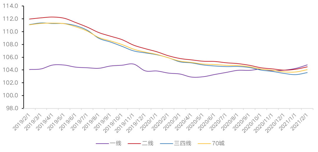 2021年前2月,全國(guó)新房銷售價(jià)格呈現(xiàn)同比上漲趨勢(shì),漲幅趨于平穩(wěn)。各能級(jí)環(huán)比漲幅有升有降,其中一線城市環(huán)比漲幅最高。具體來說,一線城市新建商品住宅銷售價(jià)格環(huán)比上漲0.5%,漲幅比上月回落0.1個(gè)百分點(diǎn);二線城市上漲0.4%,漲幅與上月持平;三線城市環(huán)比上漲0.3%,漲幅比上月擴(kuò)大0.1個(gè)百分點(diǎn)。