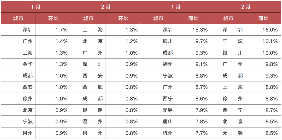 具體城市而言,我們通過對(duì)70個(gè)重點(diǎn)城市自去年2月以來的新房、二手房房?jī)r(jià)走勢(shì)進(jìn)行梳理發(fā)現(xiàn),銀川以14.9%的漲幅領(lǐng)漲新建商品住宅價(jià)格,其次為徐州;深圳二手房?jī)r(jià)漲幅高達(dá)16%,排名70城首位,寧波位居第二。