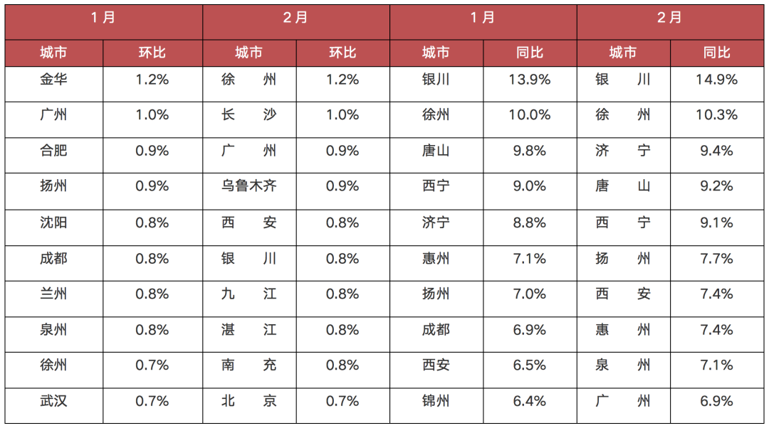 相比之下,仍有部分城市新房二手房?jī)r(jià)格較去年2月同比下降。其中新房房?jī)r(jià)同比下跌的城市有6個(gè),北海以4.2%的跌幅領(lǐng)跌70城;二手房房?jī)r(jià)下跌的城市相對(duì)較多,數(shù)量達(dá)到了21個(gè),其中牡丹江同比下降9.9%。