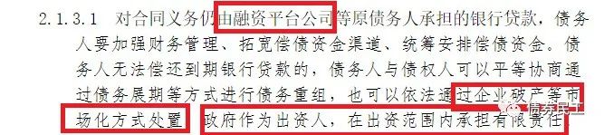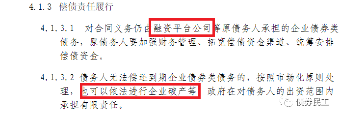 (2)對于企業(yè)債券的償債責(zé)任履行,鼓勵債務(wù)人(融資平臺公司)按照企業(yè)債券類債務(wù)有關(guān)管理政策進(jìn)行債務(wù)重組或者通過企業(yè)破產(chǎn)等市場化方式處置。這里的企業(yè)債券概念應(yīng)該是廣義上的信用債券概念,也是通過債務(wù)重組和破產(chǎn)方式進(jìn)行化解債務(wù)問題。