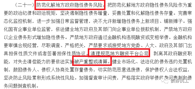 首先需要說明的是,《意見》中關(guān)于地方政府融資平臺的意見,是在“防范化解地方政府隱性債務(wù)風(fēng)險(xiǎn)”項(xiàng)下的,重點(diǎn)關(guān)注的是隱性債務(wù)。