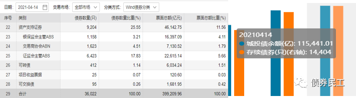 從概念上來講,地方政府融資平臺和城投公司基本上市可以劃等號的。城投債已經(jīng)是信用債券非常重要的一個(gè)組成部分。根據(jù)wind資訊的信用債研究和城投債研究統(tǒng)計(jì)數(shù)據(jù),截至2021年4月14日,信用債券存量金額為399,209.96億元,存續(xù)只數(shù)為36,022只;城投債存量金額為115,441.01億元,占信用債券的比例為28.92%,存續(xù)債數(shù)為14,404只,占信用債券的比例為39.99%。