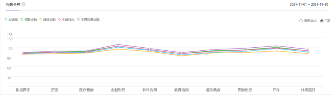 整體上男性使用者多于女性使用者,而用戶的興趣偏好分布主要集中于金融財經、軟件應用、汽車、醫療健康、教育培訓、餐飲美食、 旅游出行、影視音樂、資訊、休閑愛好等多個領域。