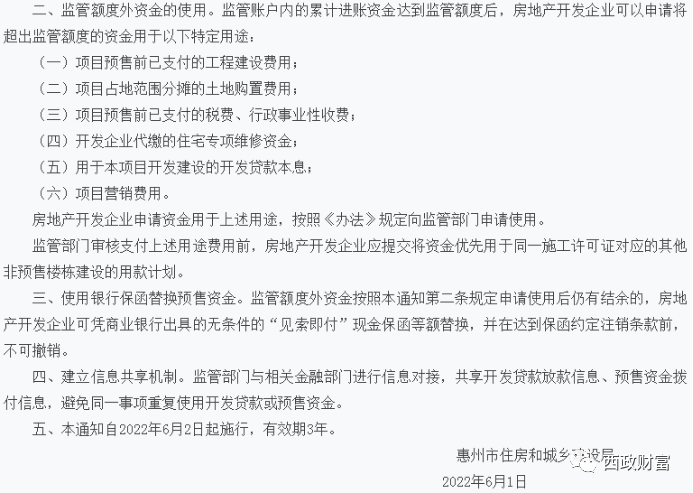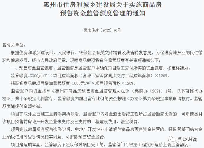 6月1日,惠州市住房和城鄉(xiāng)建設(shè)局發(fā)布《關(guān)于實(shí)施商品房預(yù)售資金監(jiān)管額度管理的通知》,我們認(rèn)為,這是一份非常具有借鑒意義的政策性文件,具體附圖如下: