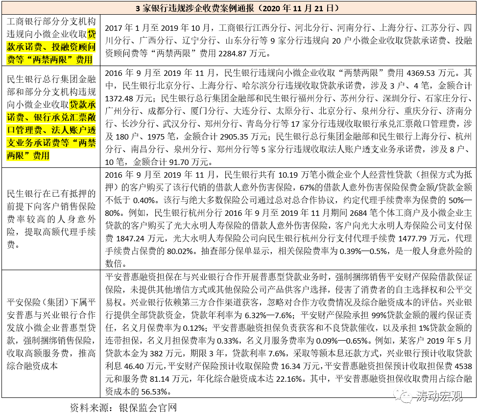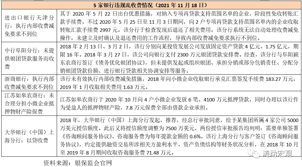 (一)2021年11月18日,銀保監會消費者權益保護局發布《關于銀行服務違規收費典型案例的通報》(銀保監消保發(2021)16號)點名五家銀行,對其涉企違規亂收費案例進行通報。這五家銀行分別為進出口銀行天津分行、中行阜陽分行、浙商銀行、江蘇如皋農商行以及大華銀行(中國)上海分行。