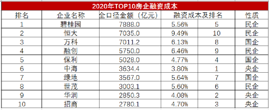 炸天團特意將2020年克而瑞榜單TOP10房企拉出來,將排名及融資成本做了個對比: