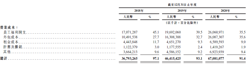 其營業(yè)成本從大到小依次是員工福利開支、外包成本、租金成本、折舊及攤銷和其他,僅前兩項(xiàng)就占到了整體成本的七成。營業(yè)成本占總收入的比重高達(dá)91%至97%,毛利空間在2020年最高時(shí)也只達(dá)到8.58%。